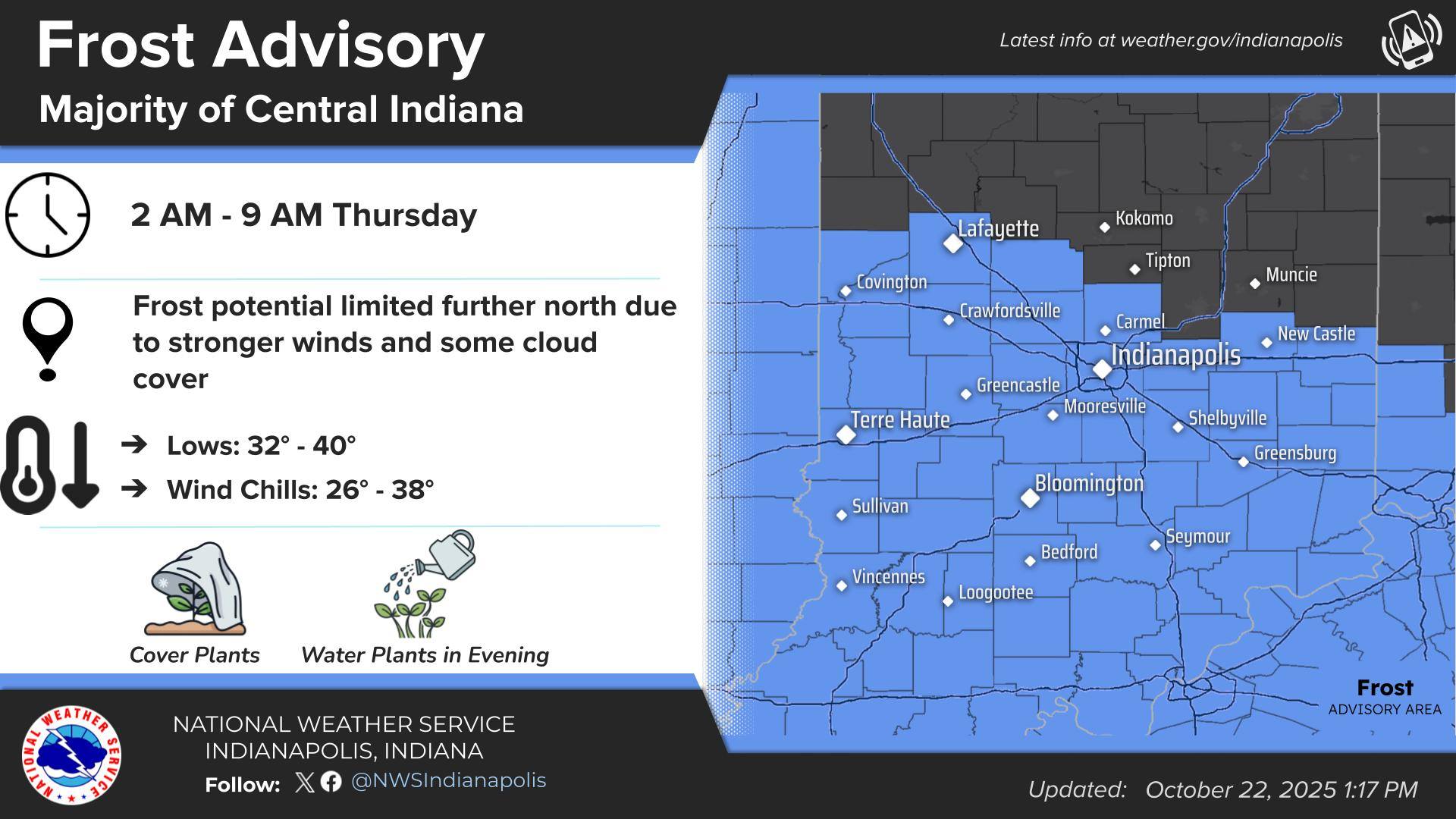 Tonight, areas of frost are anticipated across most of central Indiana, with the exception of the far northeastern regions, which will be slightly more shielded due to increased cloud cover and stronger winds. To prevent damage, it’s a good idea to take protective measures for sensitive vegetation if necessary.