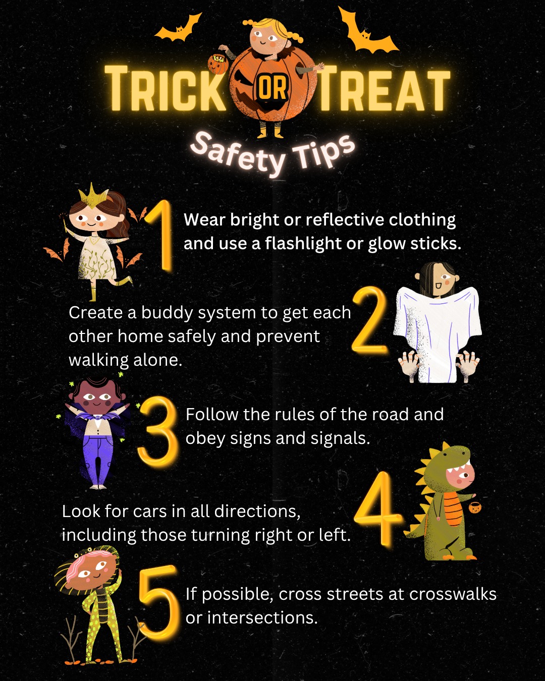 Keep your little monsters safe while they’re out trick-or-treating this Halloween! As they fill their bags with goodies, make sure they’re visible and aware of their surroundings.
