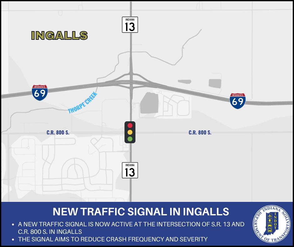 A new traffic signal is now operational at the intersection of State Road 13 and County Road 800 S in Ingalls, marking a significant upgrade from the previous two-way stop signs. The primary goal of this new signal is to reduce the frequency and severity of crashes at this intersection. To learn more about this improvement and its expected impact, visit: bit.ly/4o0T8AF