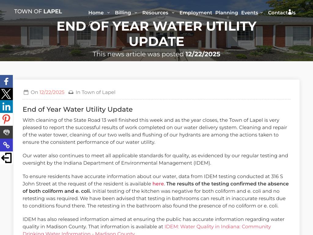 “We’re extremely pleased with the results of our maintenance efforts,” said a town spokesperson. “Our water system is the lifeblood of our community, and we’re committed to doing everything in our power to ensure it continues to meet the needs of our residents and businesses.” With the year-end maintenance program now complete, Lapel residents can look forward to a new year with confidence in their town’s water delivery system.
