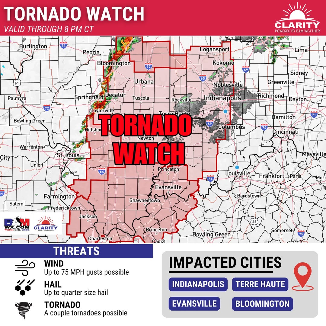 Tornado Watch Issued for Indiana, Kentucky, and Illinois: Severe Storms Expected Through 8PM CT