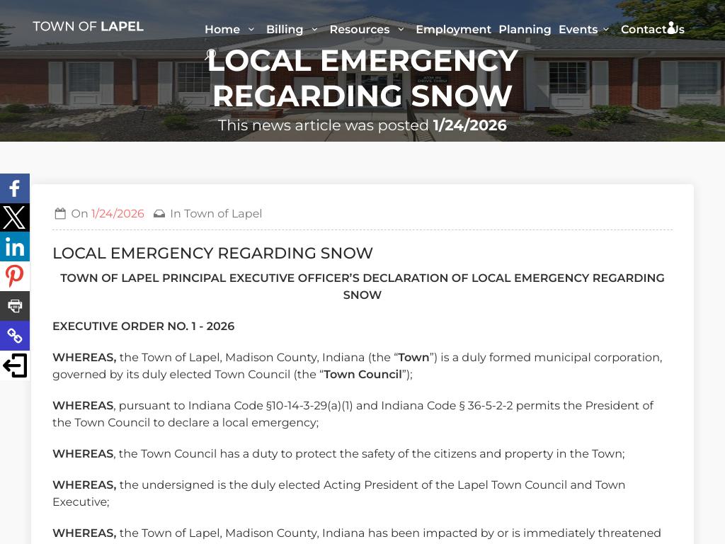 Lapel, IN – In response to the severe snowstorm that has brought heavy snowfall and hazardous conditions to our area, the Principal Executive Officer of the Town of Lapel has declared a local emergency.