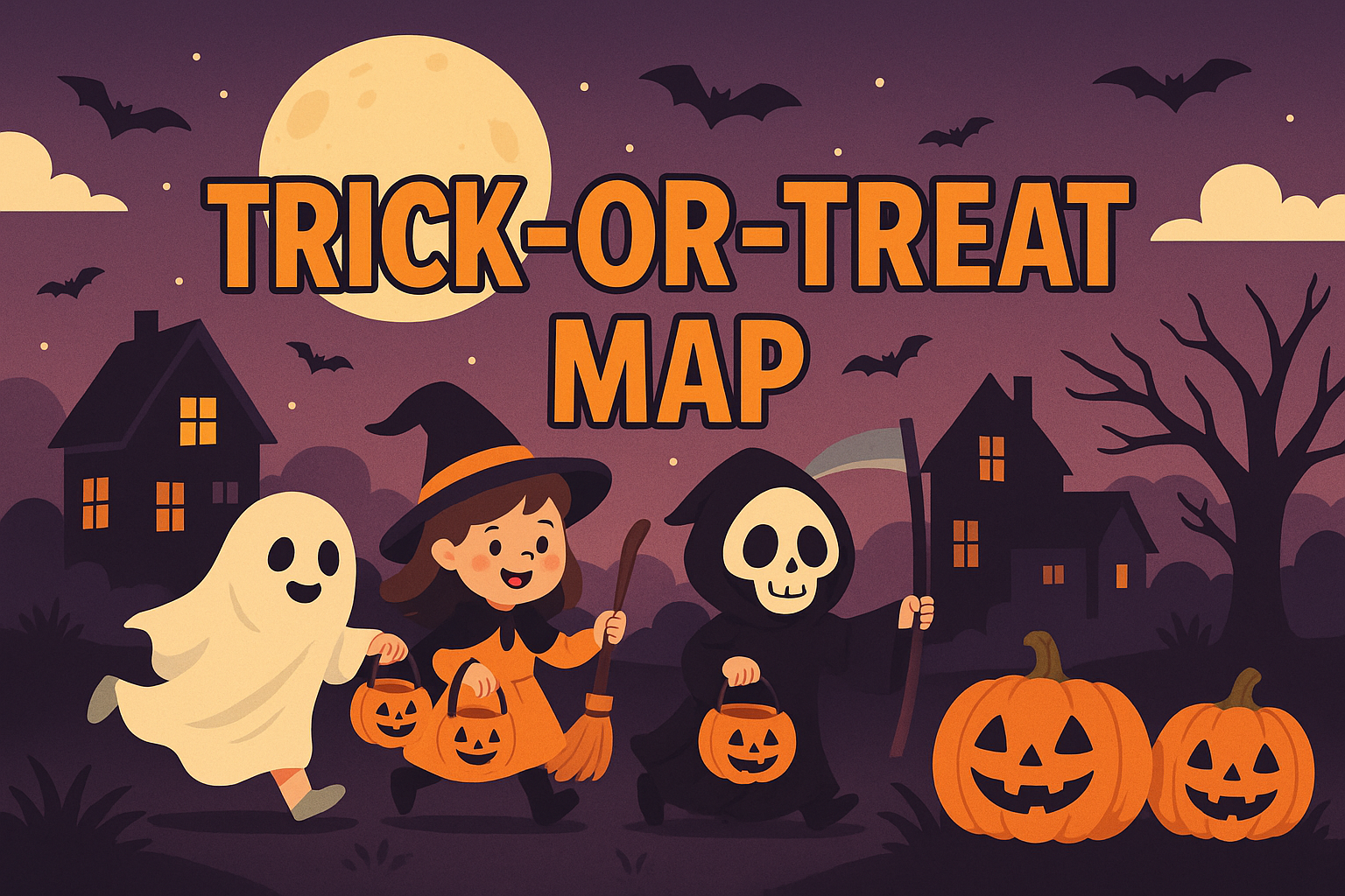 Trick-or-Treat Map You may add your address by filling in the short form below. Go backYour message has been sent Name (Optional) Warning Street Address Warning Warning Your Trick-Or-Treat Hours Select one option 5:00 – 6:00 PM 5:00 – 7:00 PM 5:00 – 8:00 PM Warning Warning Message Warning Warning. Add me to the map!Submitting form Δ Your Ad Here Sponsored content Advertise with us! Reach out to your community. Share this: Click to share on Facebook (Opens in new window) Facebook Click to share on X (Opens in new window) X Like this:Like Loading...